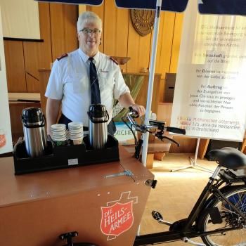 Mit dem Lastenfahrrad wird Major Michael Geymeier, Leiter des Korps Kassel der Heilsarmee in Deutschland, Menschen mit einer warmen Mahlzeit versorgen und das Rad als mobile Suppenküche in einsetzen.