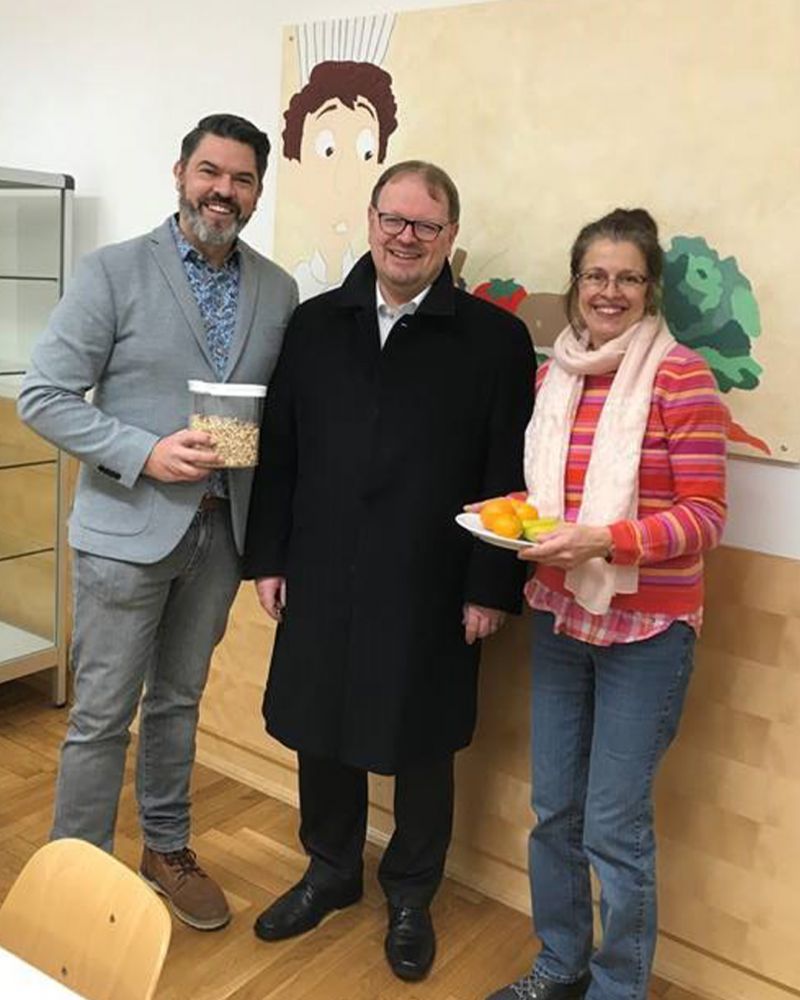 Vor dem Schulbeginn können die Kinder zwischen verschiedenen Müslisorten, Vollkornbrot mit Frischkäse und Obst wählen. Der Förderbetrag wird für die Lebensmittel sowie für die Erstausstattung mit Müslischüsseln, -spendern und Milchkaraffen verwendet.