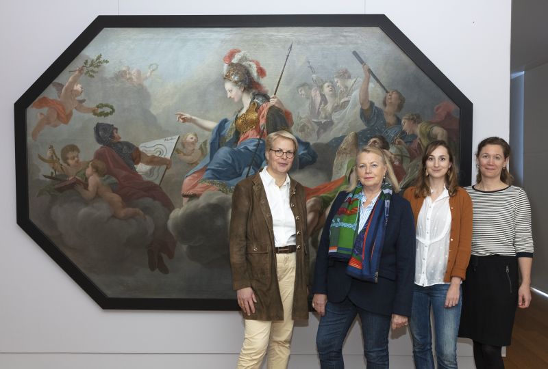 Bildnachweis: Susanne von Baumbach (Museumsverein), Nicola Mütterthies (Bürgerstiftung), Dr. Malena Rotter (Volontärin MHK) und Lena Pralle (MHK-Sprecherin) vor dem Gemälde „Minerva und die Wissenschaften“