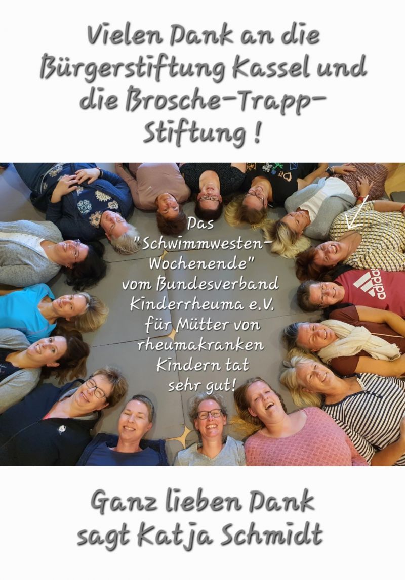 Das jährlich stattfindende ”Schwimmwesten-Wochenende" vom Bundesverband Kinderrheuma e.V. ist für Mütter von chronisch kranken Kindern. In den Sicherheitswarnungen bei Flugreisen heißt es immer: ”Legen Sie sich zuerst selbst eine Schwimmweste an, bevor Sie anderen Personen helfen." Dieses Wochenden ist eine Unterstützung, um aus dem belastenden Alltag als Pflegeperson zu kommen.